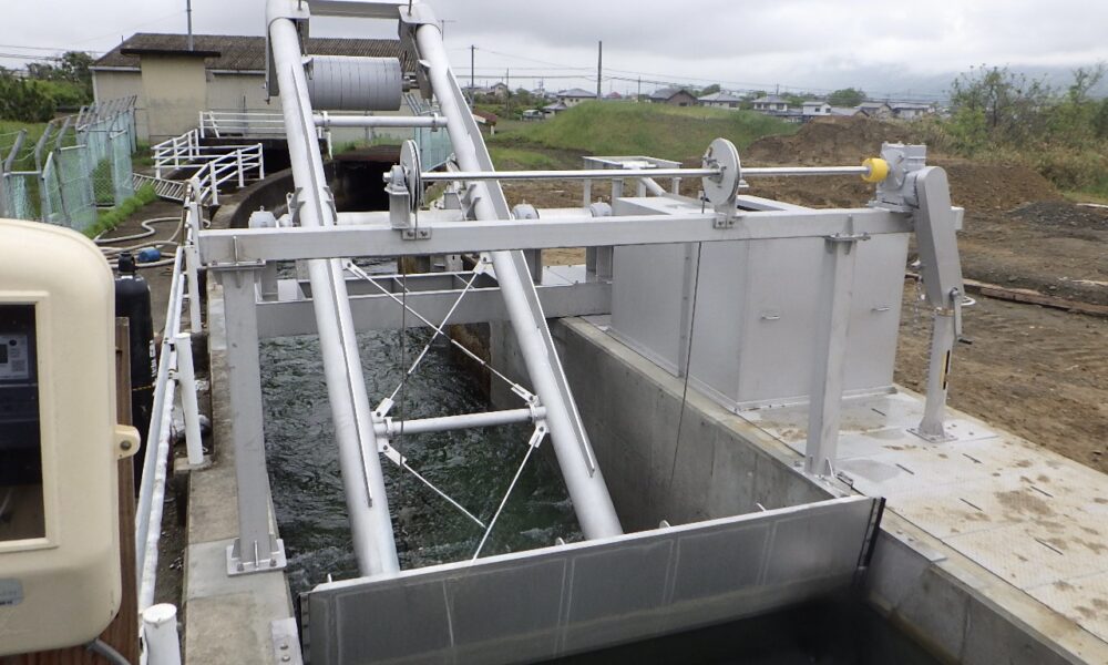 除塵機は排水機場やポンプ場に設置される設備になります。用途は水面や水中を流れてくる様々な塵芥を除塵機のレーキと呼ばれる爪で掻き揚げ、下流に流下させないことです。掻き揚げた塵芥は水平ベルトコンベアにて貯留場所へ搬送します。また、除塵機の下流側には排水用のポンプが設置されており、ポンプ保護の役割も担っています。動力は主に電動で、単独操作はもちろん、ポンプ設備との自動連動操作を行うことも可能です。